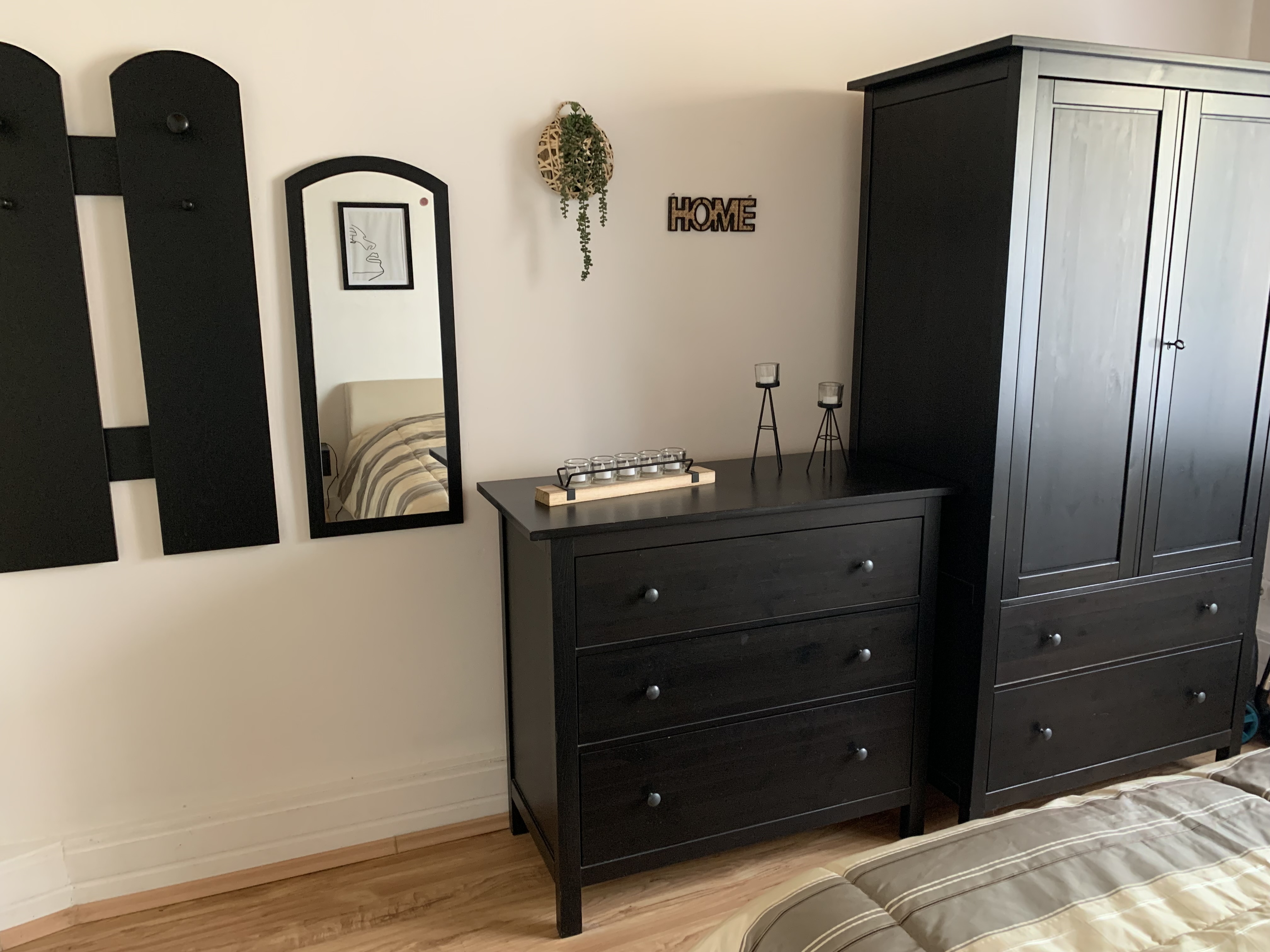 Doppelbett 180/200cm, Kleiderschrank, Kommode, Nachtschränke, Funkwecker