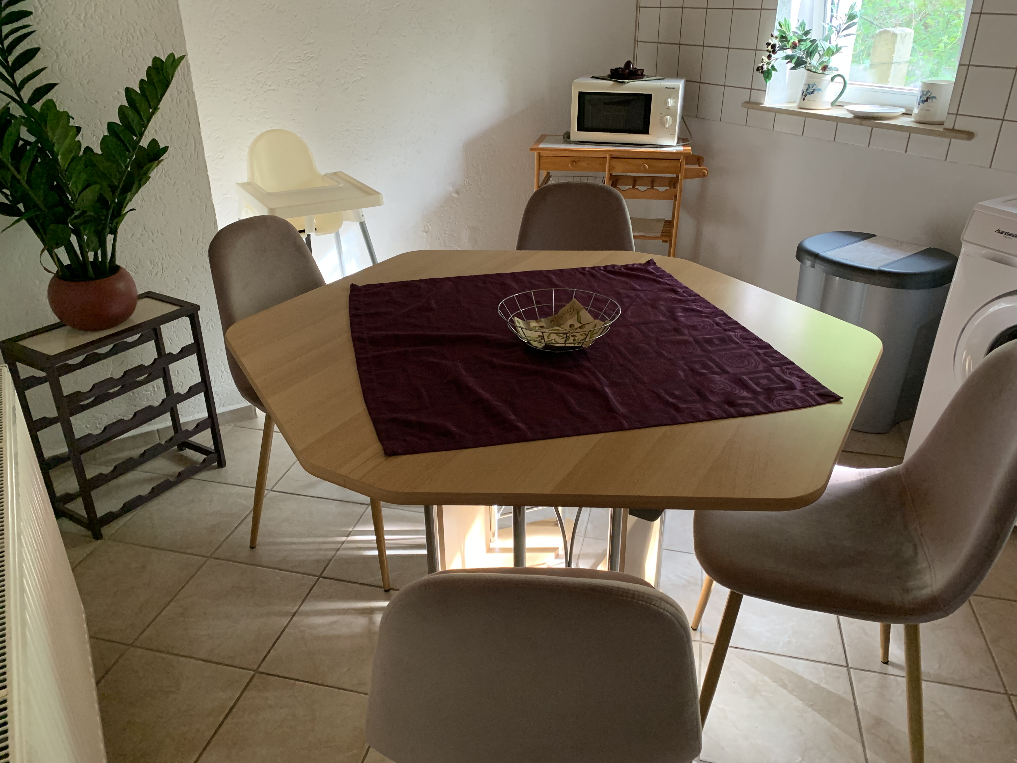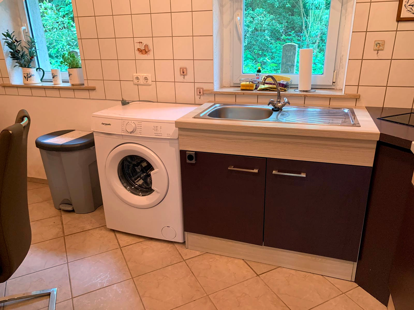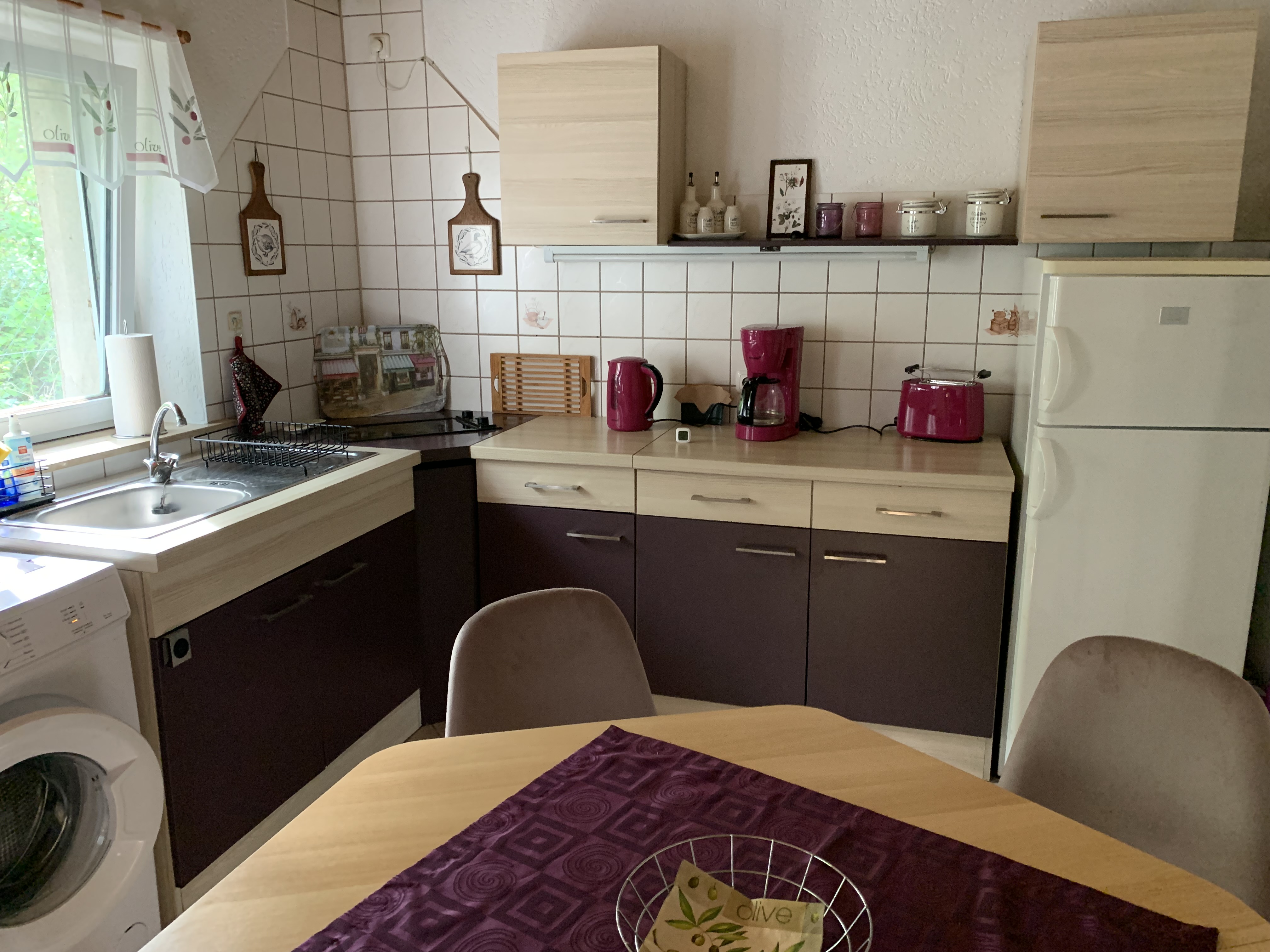 Einbauküche, Ceranfeld (2 Platten), Kühlschrank, Mikrowelle, Kaffeemaschine, Toaster, Wasserkocher, Radio, Esstisch mit Stühlen, Waschmaschine